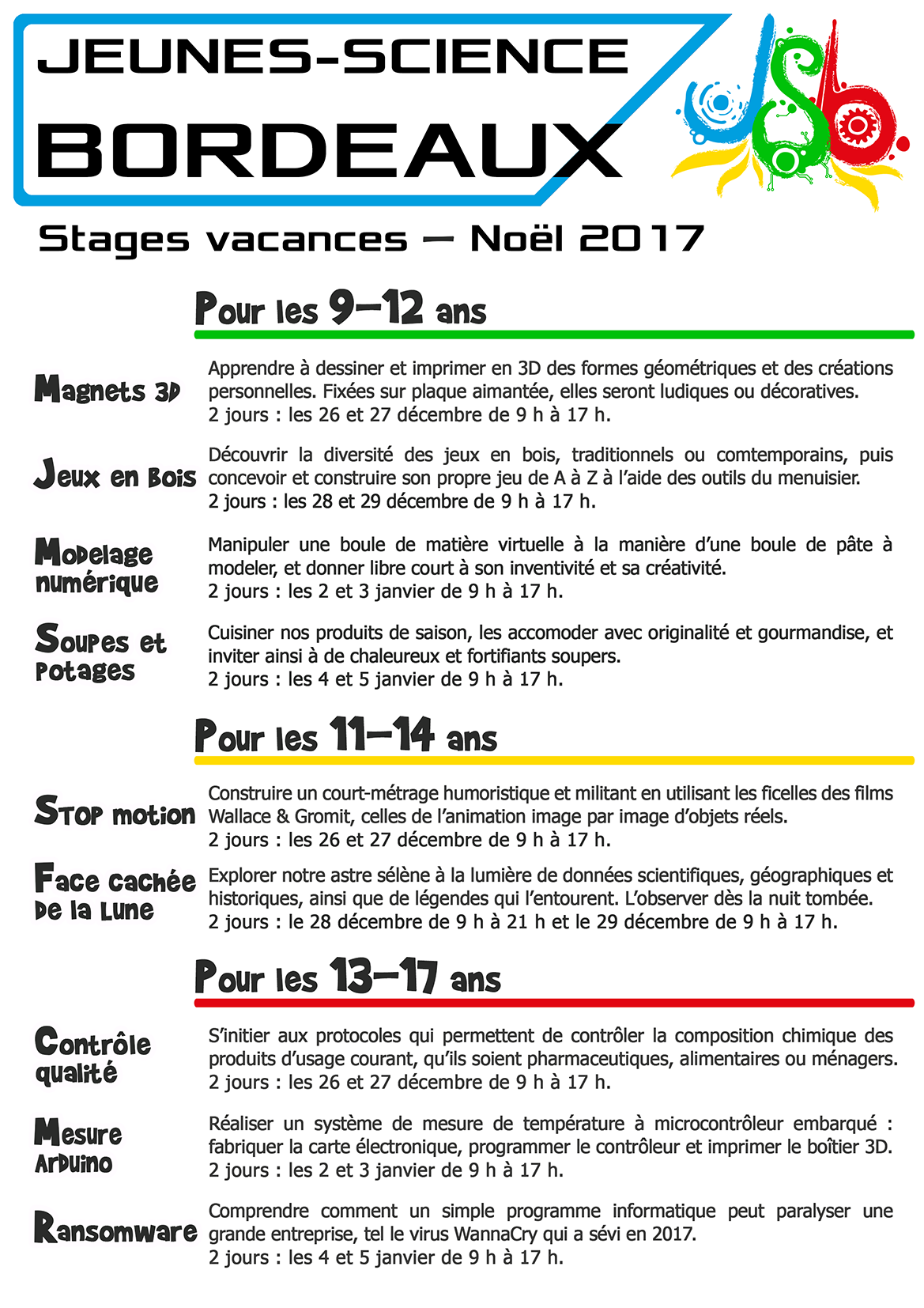 2 jours : les 28 et 29 décembre de 9 h à 17 h.