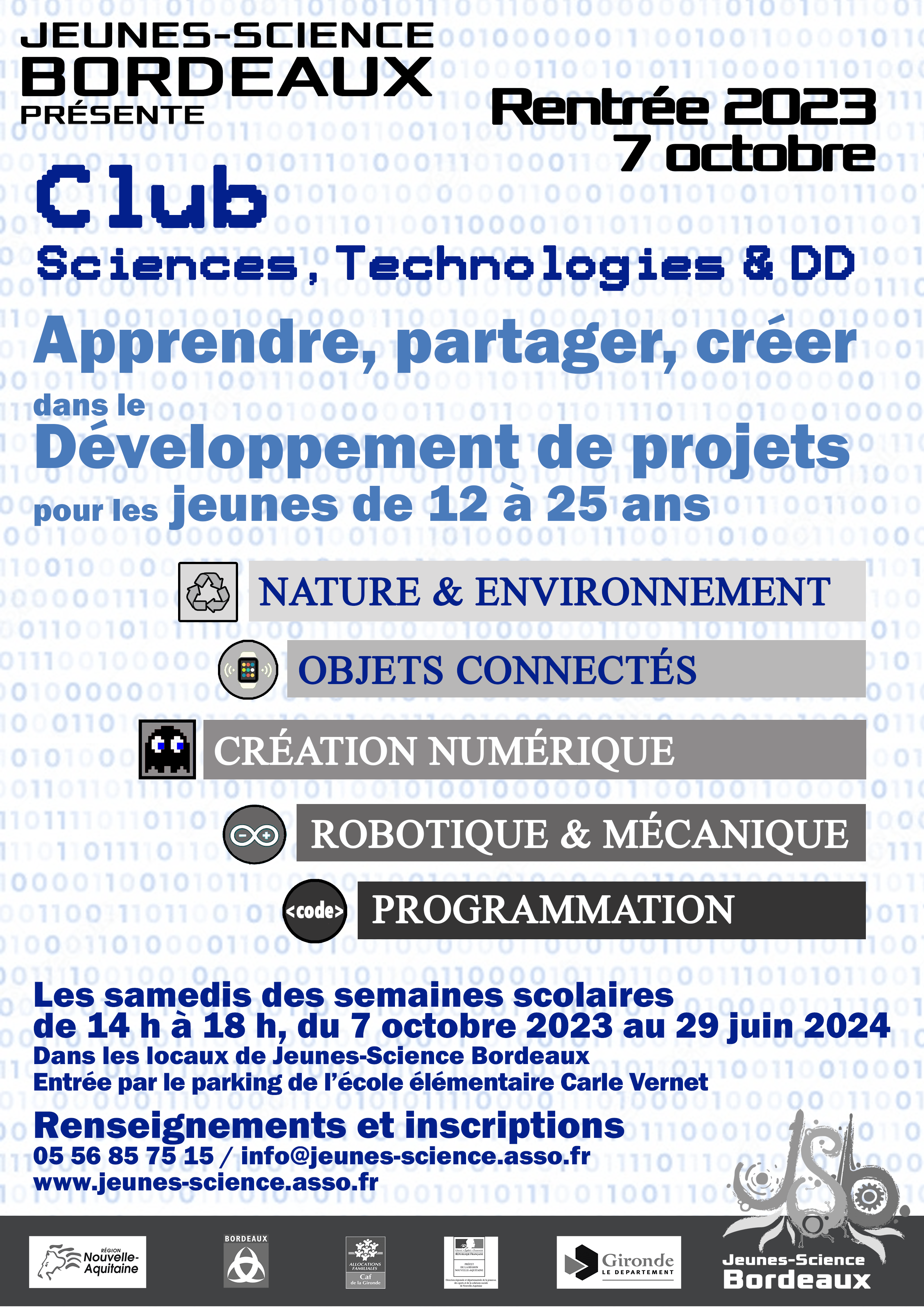 L’été se termine, la rentrée scolaire est passée, les clubs de Jeunes-Science Bordeaux reprennent leurs activités 2021-2022. Des journées de pré-rentrée sont proposées au cours de la première semaine du mois d’octobre, afin de visiter, se retrouver ou faire connaissance, ou se pré-inscrire.